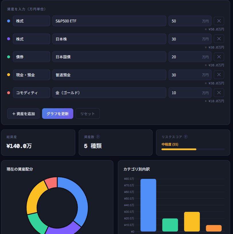 株・債券・現金・仮想通貨など保有している資産を入力するだけで、配分をグラフ化してリスクスコアを表示。さらに5年・10年・20年後の資産シミュレーションまで、すべて無料で使えます。